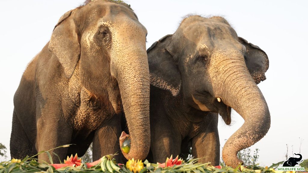 Maya, aged 51, and Bijli, aged 45, continue to thrive under Wildlife SOS’s dedicated care despite their health challenges. Maya, with impaired vision, and Bijli, with a deformed hind leg from an old fracture, receive regular treatment, nutrition, and care. Both have shown remarkable resilience and steady recovery through expert medical attention and compassionate rehabilitation. To commemorate their 15th rescue anniversary, the Wildlife SOS team organised a grand fruit feast, featuring a colourful spread of sugarcane, watermelon, papaya, banana, beetroot, and cauliflower, celebrating their remarkable journey from pain to peace.